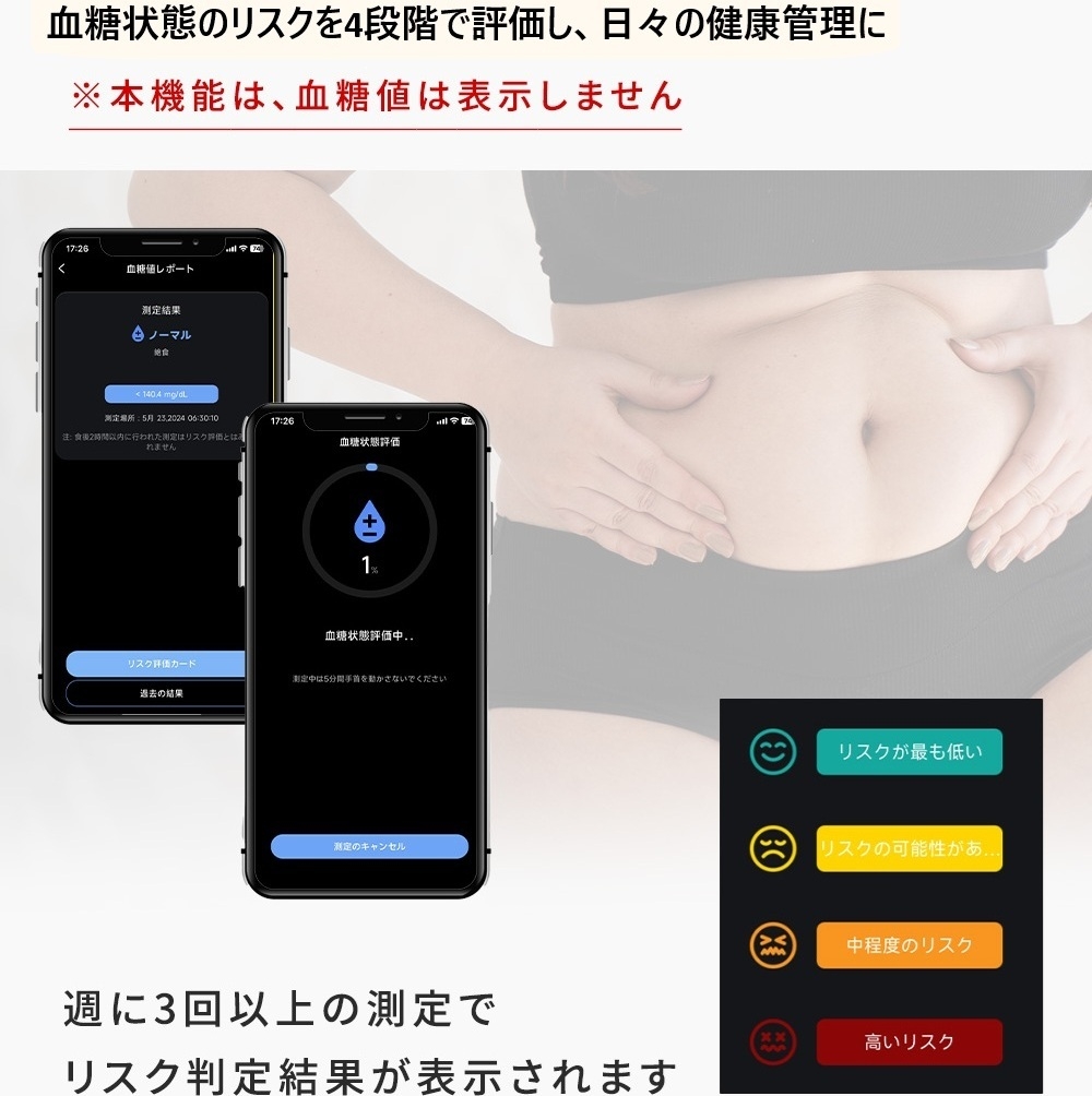本製品は、血糖状態をはじめ、心拍数・血中酸素濃度・睡眠状態・表皮温度・ストレス・歩数・消費カロリーといった多彩なデータを計測。さらに、家族など複数人のデータを共有できる「グループ健康管理」機能や、週間・月間単位で健康状況を振り返る「AIレポート機能」も搭載しています。