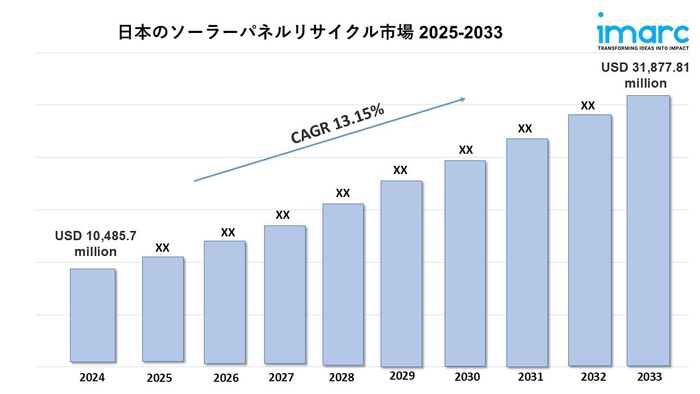 IMARCグループの最新の調査出版物「日本の太陽光パネルリサイクル市場の規模、シェア、動向、予測プロセス、タイプ、素材、有効期限、地域、2025-2033年」によると、日本の太陽光パネルリサイクル市場の規模は2024年に104億8,570万米ドルに達しました。今後、IMARCグループは、市場が2033年までに318億7,781万米ドルに達し、2025年から2033年の間に13.15%の複合年間成長率(CAGR)で成長すると予測しています。