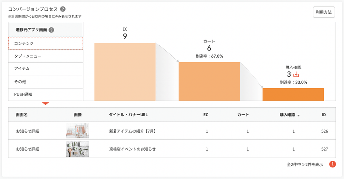 「ECコンバージョン計測」機能では、アプリからECサイトへの送客人数や購買に至った人数(コンバージョン)、アプリのどの画面から遷移し購買へ至ったのかを把握するコンバージョンプロセスなどの数値を可視化し、アプリとECサイトをつないで顧客が購買に至るまでの経路分析が可能です。
