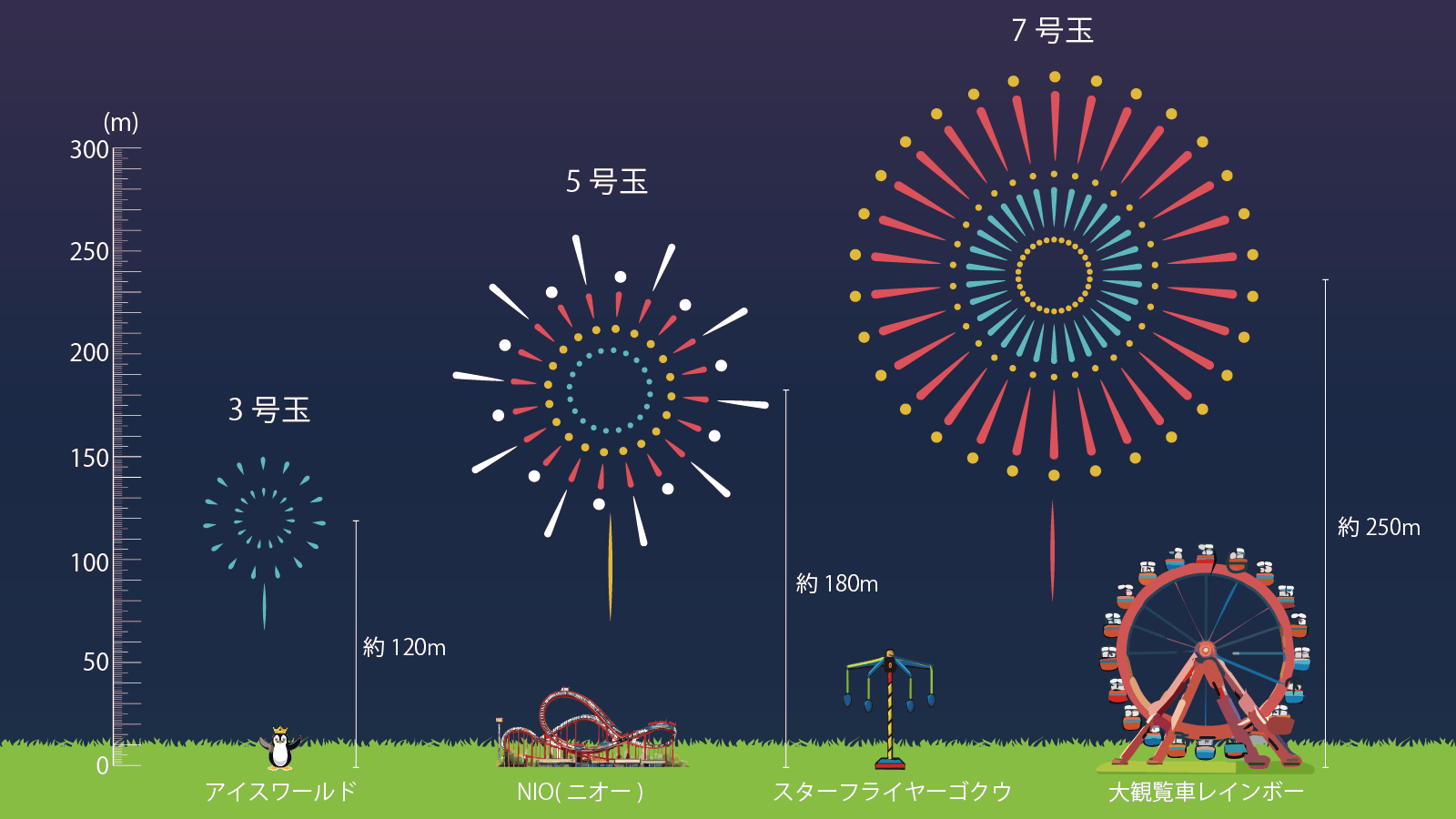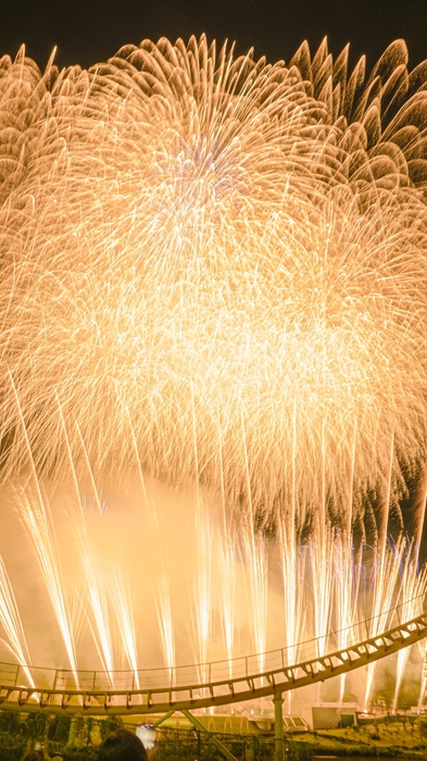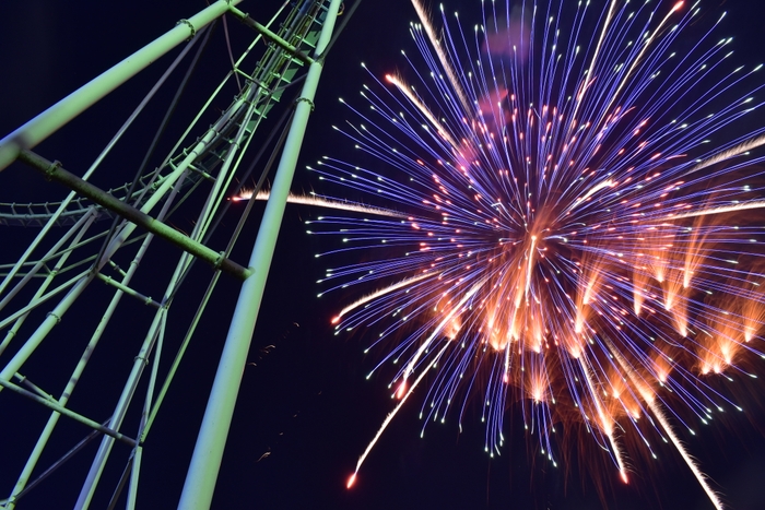 高さ・直径ともに大観覧車レインボーの2倍以上で目の前を覆いつくす花火は火薬の熱さを感じるほど。