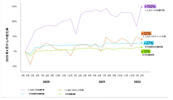 Microsoft 365の生産性関連の傾向を分析すると、会議やチャットが増加傾向にあり、従来の9時から5時までの勤務時間の枠を超えて頻繁に行われていることがわかります。実際、平均的なMicrosoft Teamsユーザーの週あたり会議参加時間は2020年3月と比較して252%増加し、時間外および週末の作業時間はそれぞれ28%、14%増加しています。昼食時の会議を減らすなど、人々が自分のニーズに合わせて1日の過ごし方を変えているのは素晴らしいことです。しかし、柔軟な働き方を持続させるためには、マネージャーは新しい規範を作り、24時間365日働き続けることが無いような境界線を設定する必要があります。
