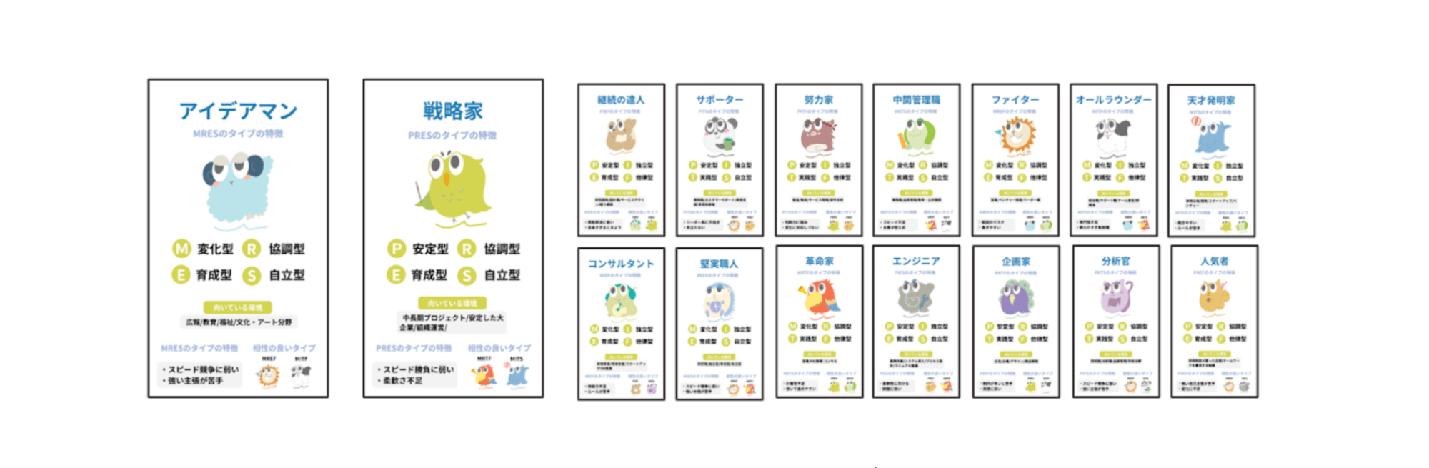 学生は事前に20問のアンケートに回答してもらい、16タイプのキャリア診断を行なっていただきました。当⽇はその診断結果をもとに自己理解を深めながら相性の良い企業とのマッチングを行いました。