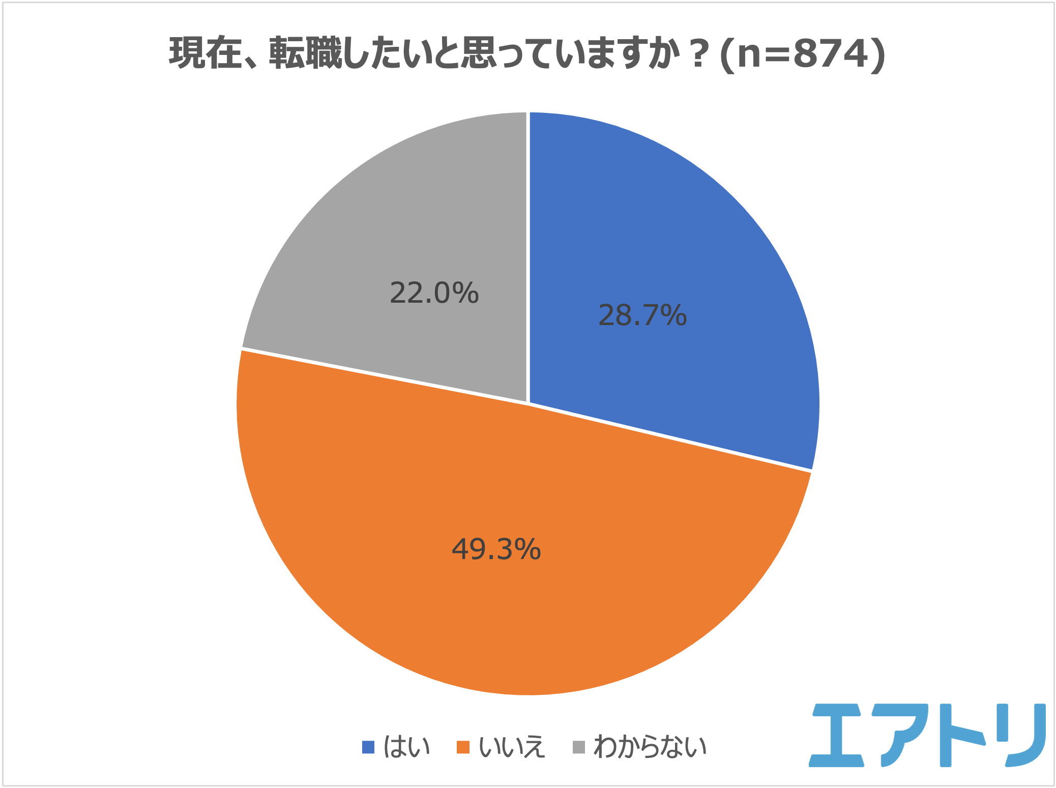 49.3%の人が現在、転職をしたいと思っていない(いいえ)と回答しました。転職を「したい」人が28.7%、「わからない」と回答した人が22.0%となりました。