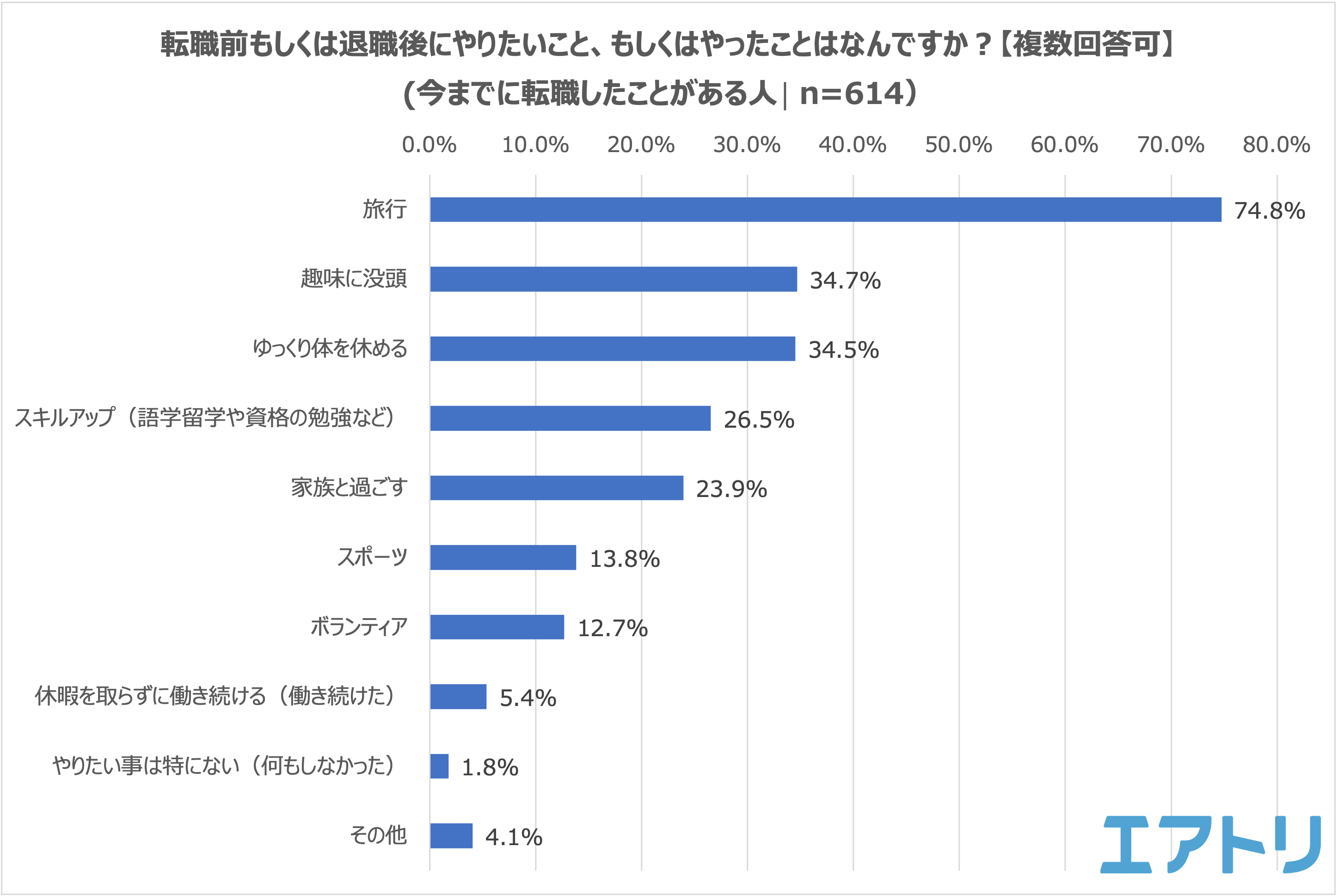 転職前もしくは退職後にやりたい・やったこと1位は「旅行(74.8%)」で2位以下に大差をつけました。ついで2位「趣味に没頭(34.7%)」3位「ゆっくり体を休める(34.5%)」となりました。