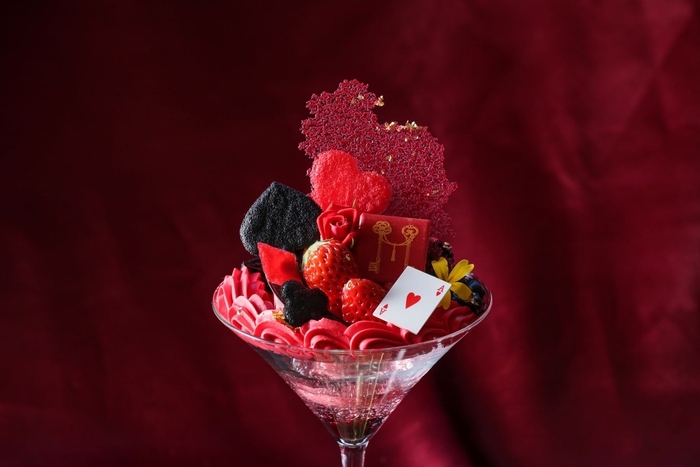 今回の大人のご褒美パフェは“ダークプリンセス~不思議の国のアリス~”をテーマに赤と黒の世界を甘酸っぱい“ラズベリー”と苦みが程よい“ブラックチョコレート”で表現。