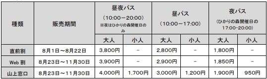 参加費:無料 ※ただし、入場には別途鑑賞パスポート(昼パス)又はエリア入場券(大人500円、小人200円)が必要