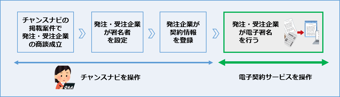 ビジネスチャンス・ナビ上に案件を掲載した発注企業と、エントリーを行った受注企業との契約締結に、本システムが提供する電子契約サービス(※)を利用することができます。