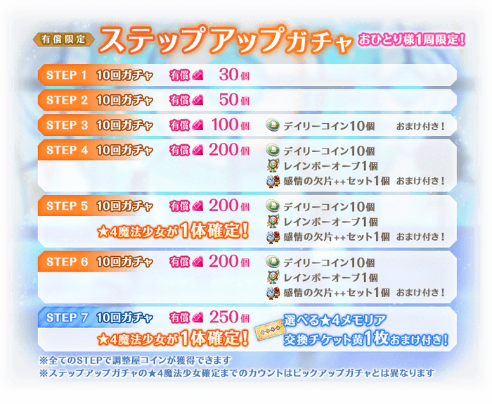 ※STEP5、STEP7での★4魔法少女について、ピックアップ対象の魔法少女が確定するわけではございません。