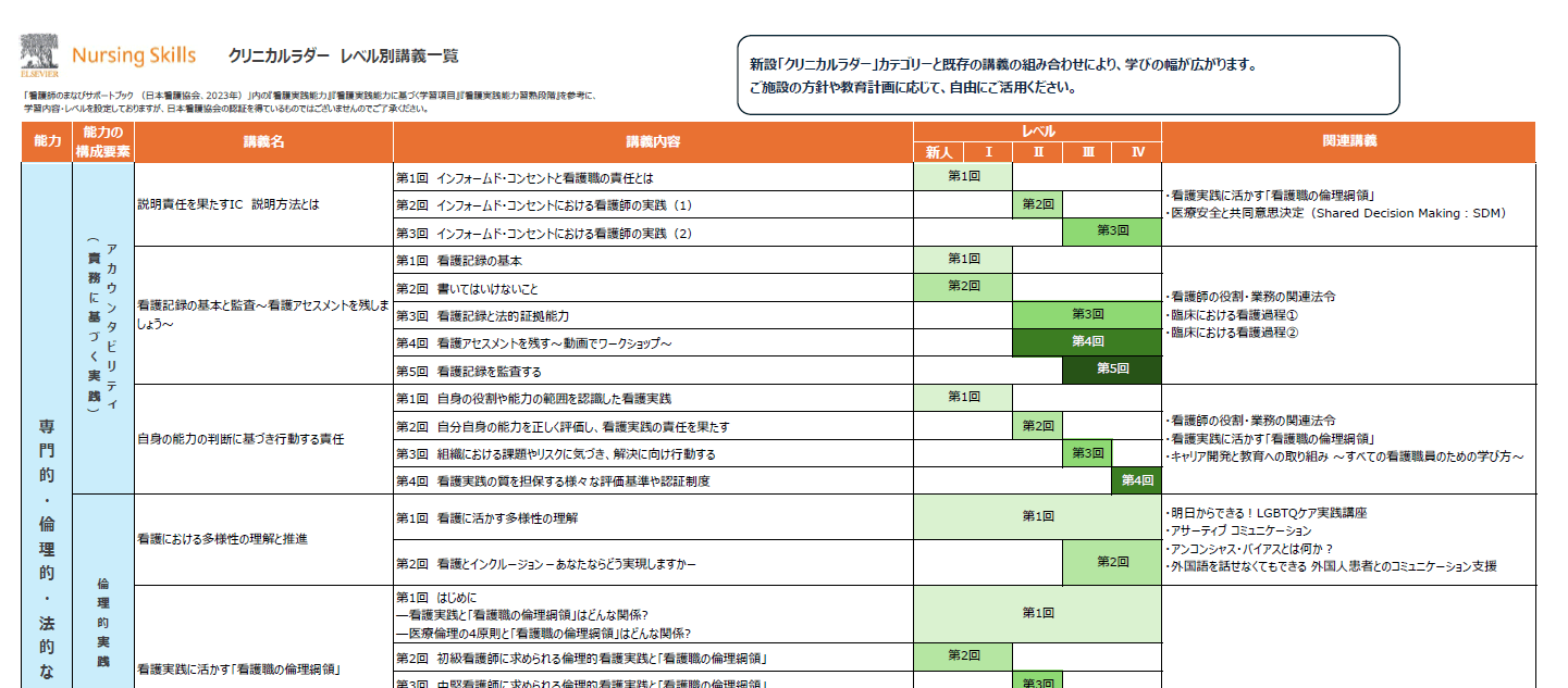 クリニカルラダーのレベルと関連講義の詳細については、以下をご覧ください。