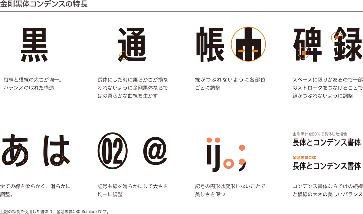 「金剛黒体コンデンス」は、様々な用途に合わせて使用できるように、基準となる金剛黒体から90%、85%、80%、75%の4種類の横幅と6ウェイトで展開するコンデンス書体です。