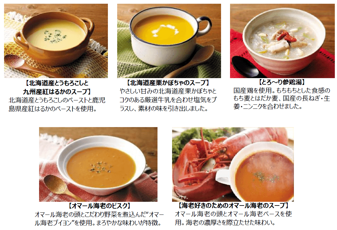急速冷凍でおいしさと栄養をそのまま閉じ込め、素材の味を最大限に引き出したナチュラルな味わいに仕上げました。調味料・着色料など食品添加物に配慮した冷凍スープ。現在新フレーバーも合わせ7種類を展開。