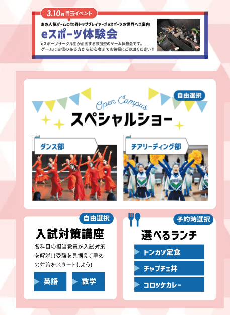 環太平洋大学は3月10日(日)に第1回オープンキャンパスを開催します。当日は、eスポーツ体験会やスペシャルショーなど、目玉イベントが盛りだくさんの企画になっています。また、来場者へのノベルティプレゼントもご用意しています。ぜひご参加ください!