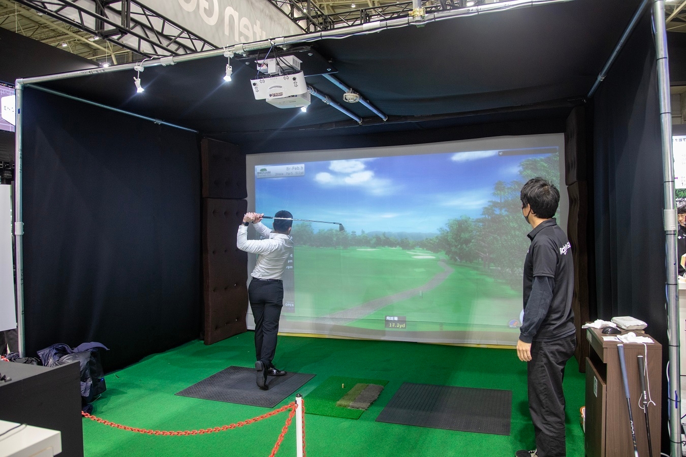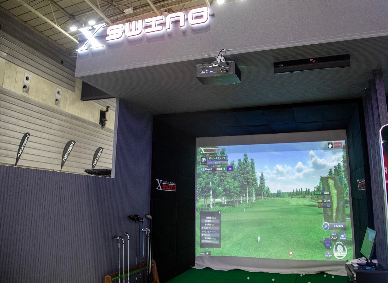 コンポーネントコーナーでは、ユニバーサルゴルフ社がオリジナルで開発したインドアゴルフ組み立てキットに、WUXGA(1,920×1,200)解像度の高輝度、短焦点レーザープロジェクター「LU935ST」が、創建メガのゴルフシミュレーターとの組み合わせで設置。同ブースでは、ゴルフタレントのいづみんさんが試打を行い、来場者の注目を集めました。
