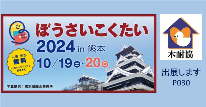 木耐協(正式名称:日本木造住宅耐震補強事業者協同組合/事務局:東京都千代田区/理事長:小野秀男/組合員:全国約1,000社)は、10月19日(土)・20日(日)に開催する「第9回防災推進国民大会(ぼうさいこくたい)2024in熊本」にポスター出展することとなりました。(https://bosai-kokutai.jp/2024/p030/)
