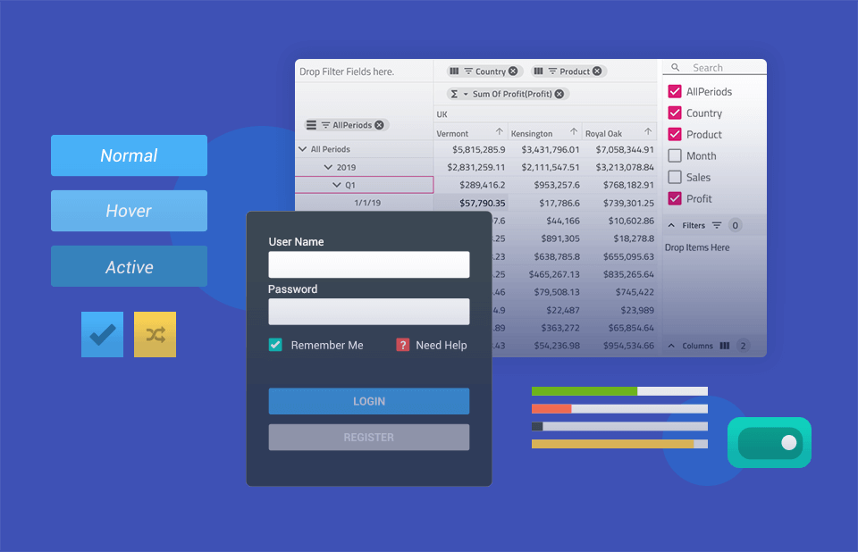 ピボットグリッドやMicrosoft Excelライクの様々なグリッドにおけるドラッグ&ドロップUI、Angularのカスタムサマリー、Blazor向けのドックマネージャー、トースト、スナックバー、スライダーなど大量のフレームワークコンポーネントでアプリケーション開発をサポートします。