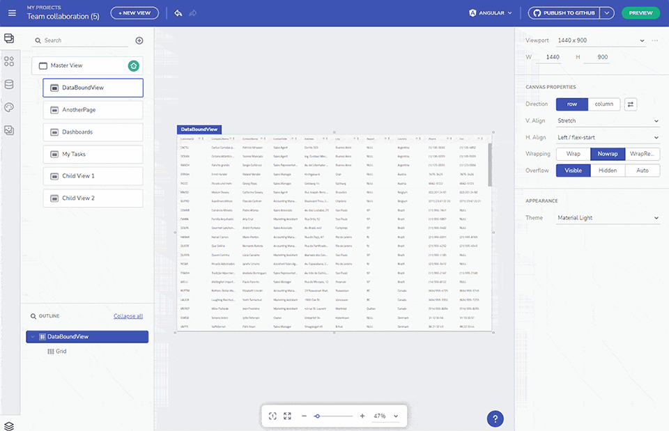App Builder( https://jp.infragistics.com/products/appbuilder )オンプレミス版はローカルネットワークに安全に設置できるため、データとデザインを外部から保護し、実際のデータ(ローカルホスト、オンプレミス、クラウドホスティング)またはアプリケーションデザイン内のスキーマに基づいて自動生成されたモックデータにライブアクセスすることができます。このライブデータアクセスのサポートは、今年初めに機能追加されたODataとJSONのデータバインディング機能を元にしており、アプリケーション構築プロセス中に実データへ接続することができます。さらに、App Builderを収録しているIndigo.Design( https://jp.infragistics.com/products/indigo-design/overview-v2 )Systemには、Bootstrap、Fluent、Indigo用のライトとダークの両方のテーマでMaterial UI Kitを追加しています。