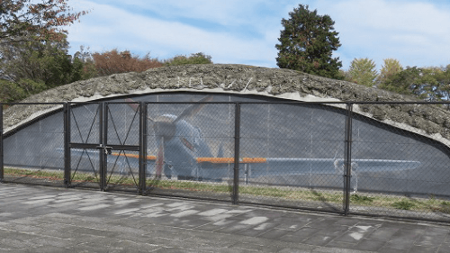 公園内の掩体壕(空襲から戦闘機を守った格納庫)と出土プロペラ展示
