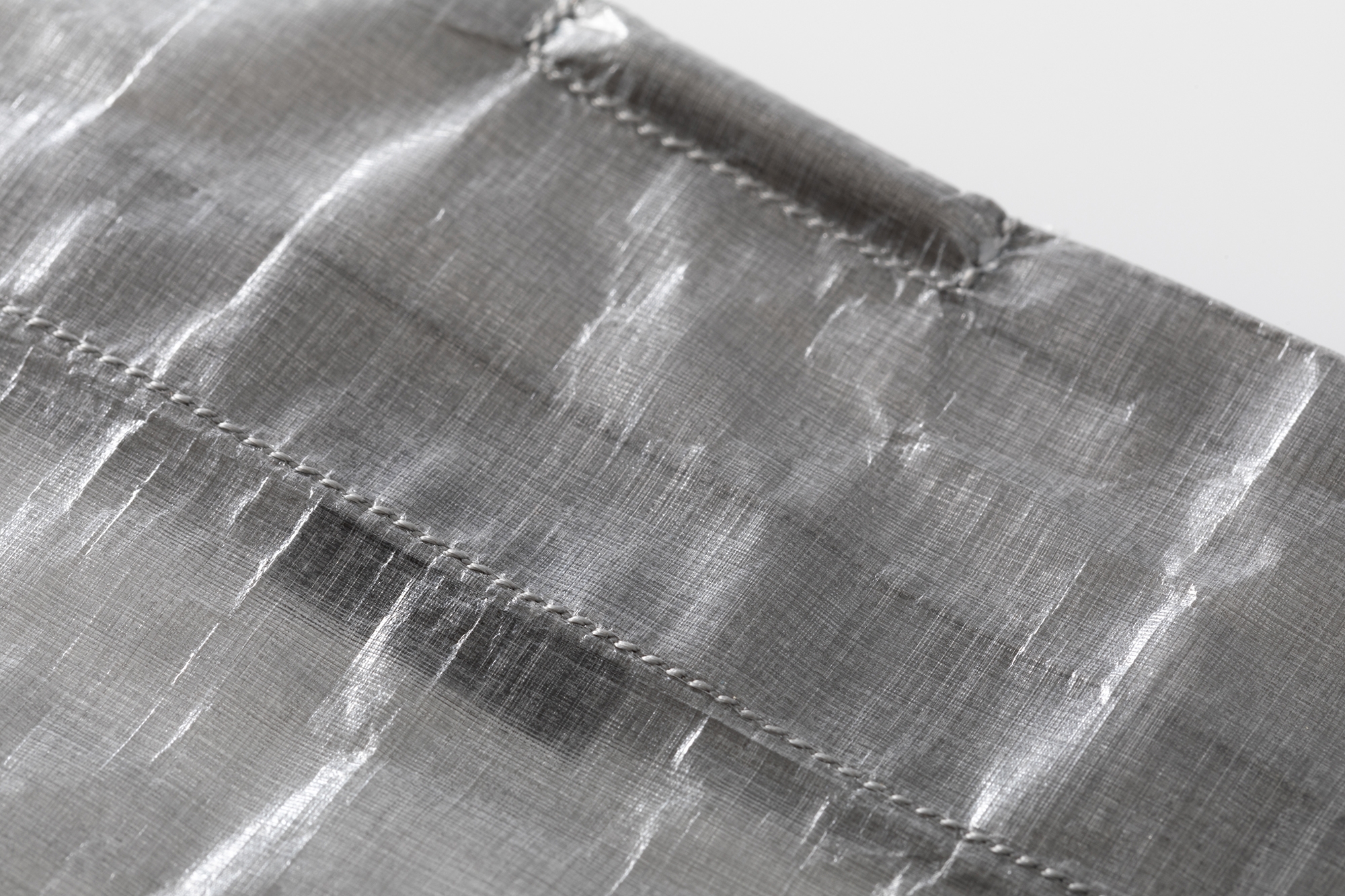 世界最強クラスの繊維Dyneema(R)をポリエステル樹脂でコーティングした究極に薄いフィルム素材の生地です。スチールの約15倍*の強度ながら、比重1.0未満で水に浮くほど超軽量です。また、表面にあるフィルムの重なりによる縞模様は、自然素材のようにどれ一つ同じものはなく、さらには質感の変化も楽しめます。たとえばGrayは、使いこむことで金属のような質感が紙のような風合いなっていきます。