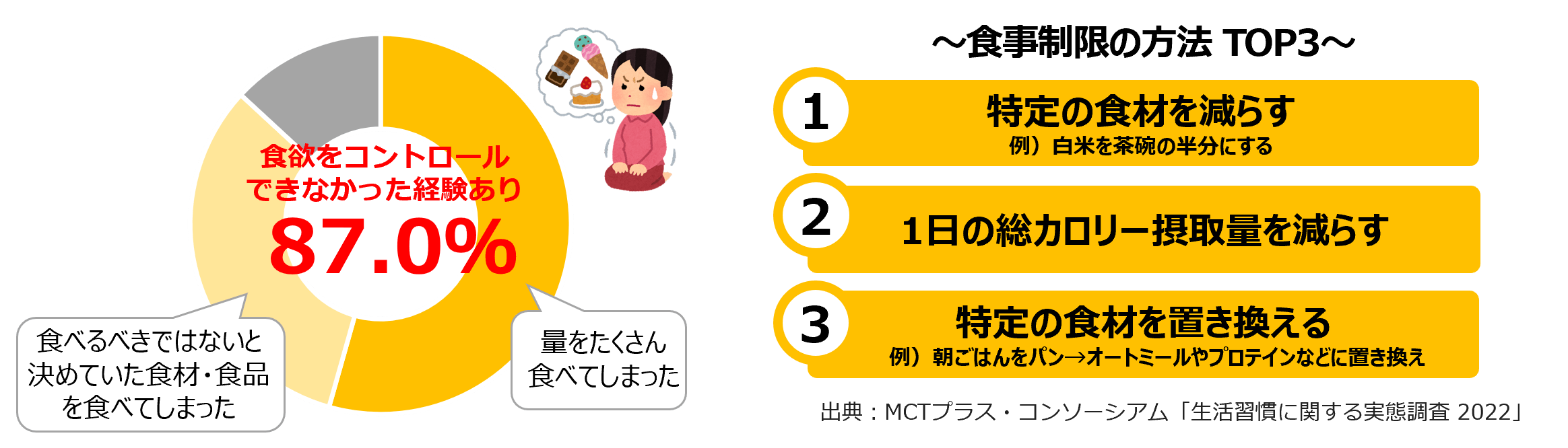 調査結果によると、食事制限ダイエット経験者のうち87.0%の人が「食欲をコントロールできなかった経験がある」と判明。おかわりなどで量をたくさん食べてしまったり、自分で食べないとルールを決めていたにもかかわらずその食品を食べてしまったりと、我慢と誘惑との戦いに負けてしまうダイエッターが続出している実態が明らかになりました。