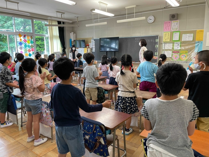 東京都羽村市の小学校では、6月より1〜4年生の英語教育の活動に『Mimmyアドベンチャー』を導入しました。初日となる6月3日(木)は、1年生の2つのクラスで、今年度3回目となる外国語の活動が実施され、『Mimmyアドベンチャー』を利用し、「動物で遊ぼう」をテーマにアメリカ現地とオンラインで交流を行いました。