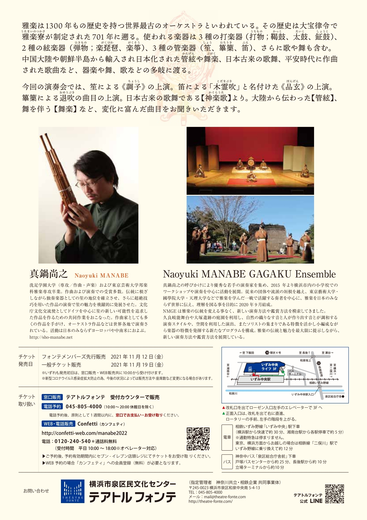 Naoyuki MANABE GAGAKU Ensemble主催による、Naoyuki MANABE GAGAKU Ensemble ~管絃と舞楽の世界~『レクチャー&コンサート 雅楽 新春の調べ』が2022年2月12日 (土)に横浜市泉区民文化センター テアトルフォンテ ホール(神奈川県横浜市)にて上演されます。チケットはカンフェティ(運営:ロングランプランニング株式会社、東京都新宿区、代表取締役:榑松 大剛)にて発売中です。