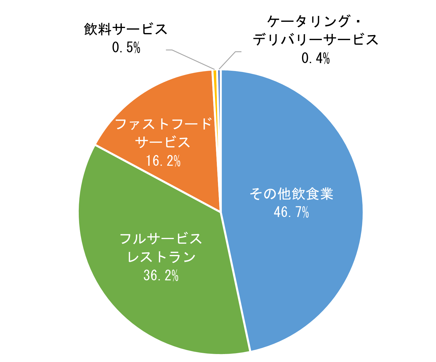 企業数を細分類業種別に集計した結果、軽食やスナックなどの販売を含む「その他飲食業」(351社、46.7%)が最多で、次いで「フルサービスレストラン」(272社、36.2%)、「ファストフードサービス」(122社、16.2%)が続きました。(図1)