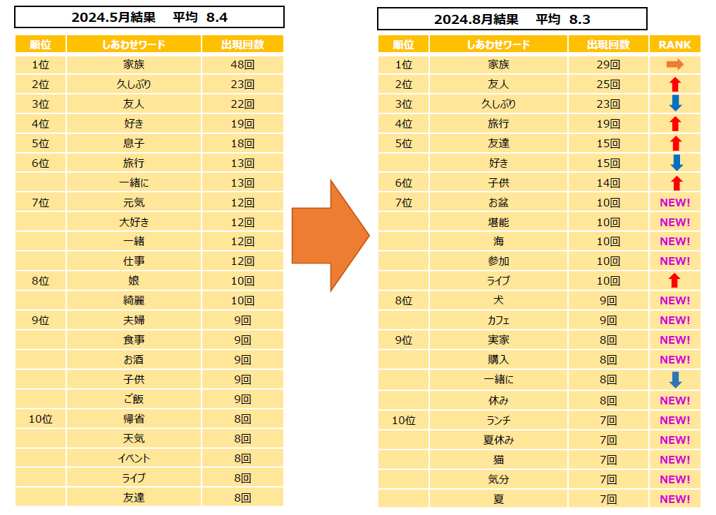 しあわせ予測でのキーワードは5月では「家族」というワードが目立ったが8月の予測では減少したこと以外は、ほぼ変化はなかった。