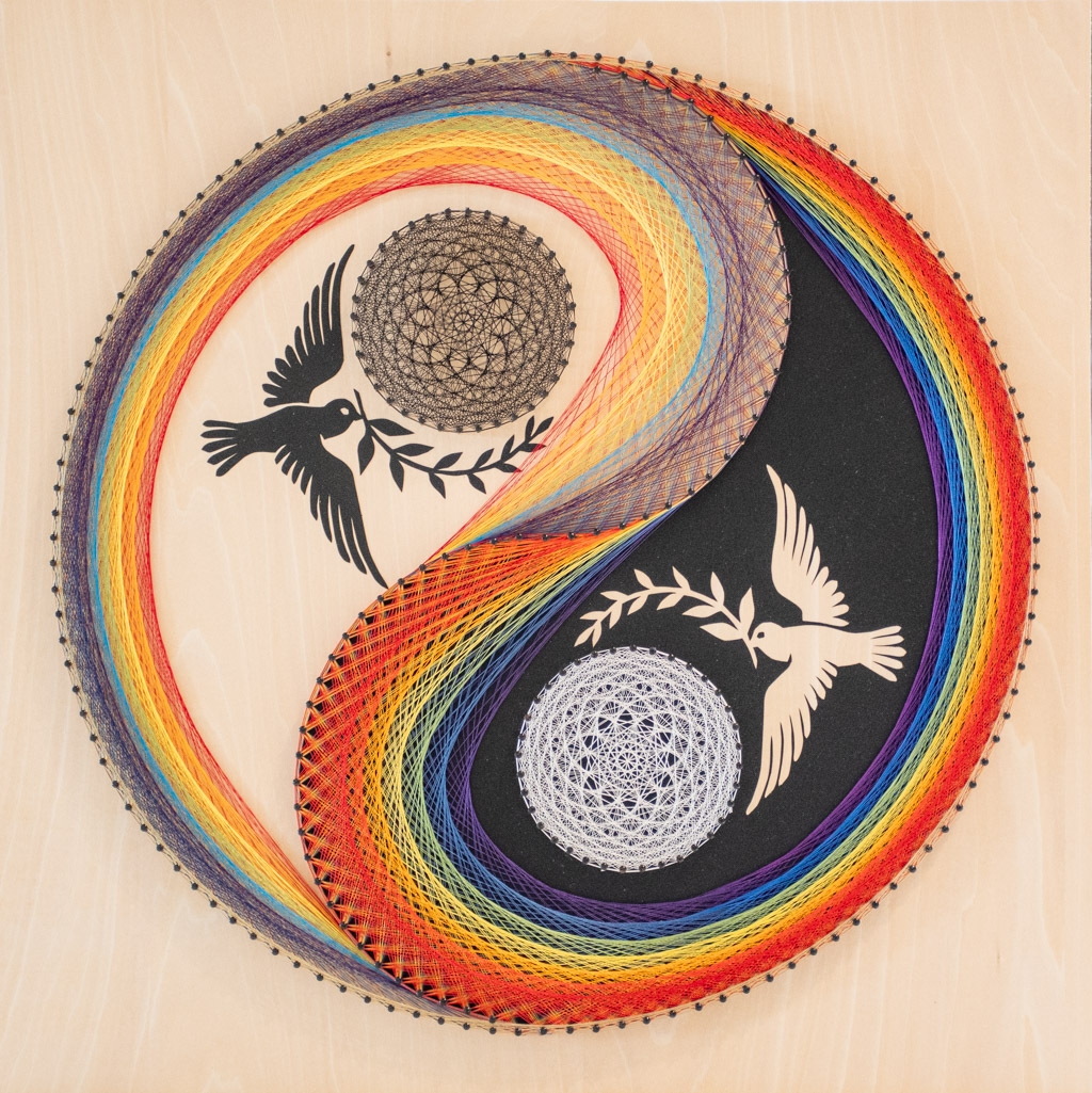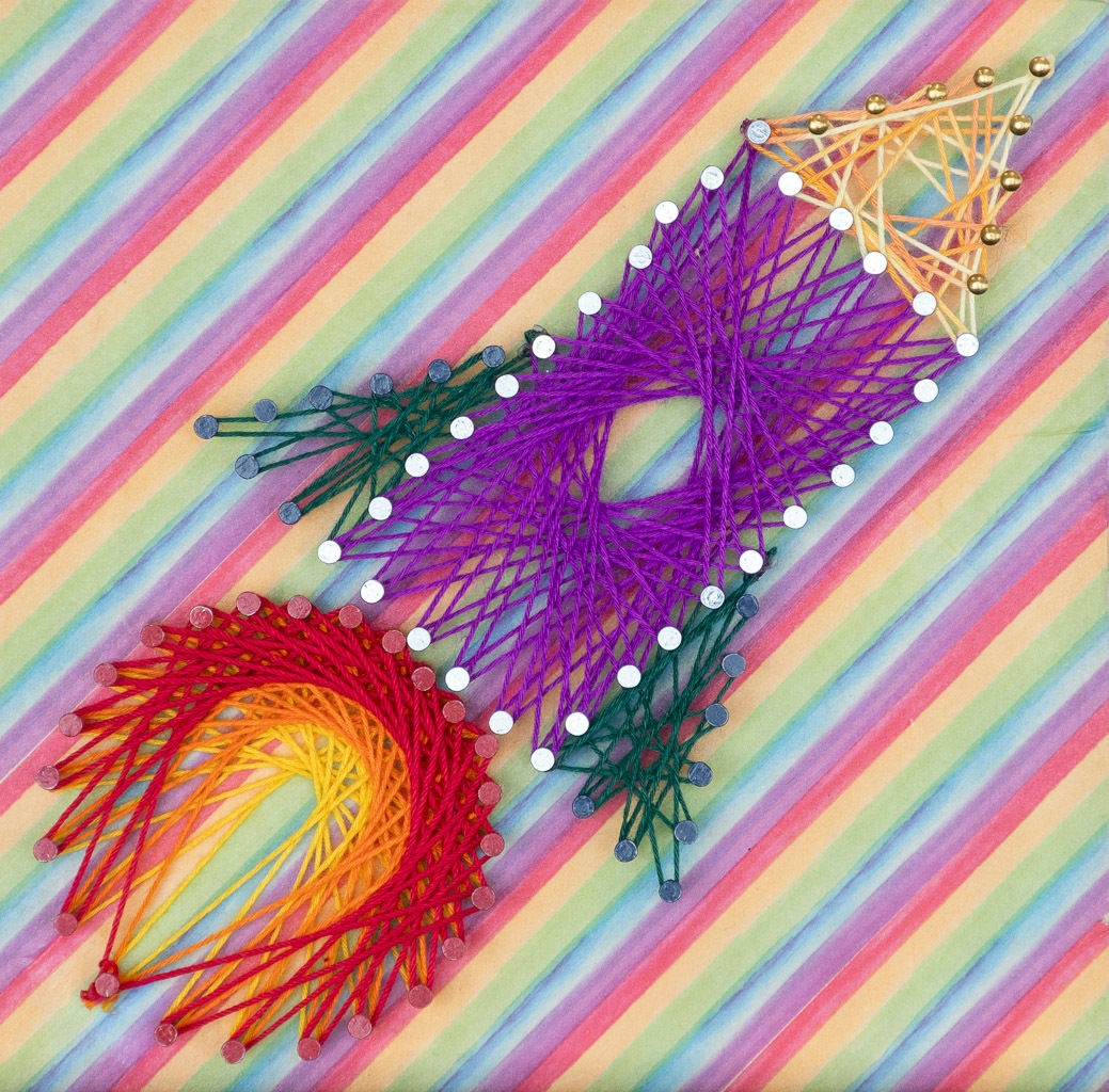 ストリングアートとは、板に釘を打ち込み、糸をかけて、模様や形を表現するアートです。主に欧米を中心に、子どもから大人まで幅広い世代に親しまれています。