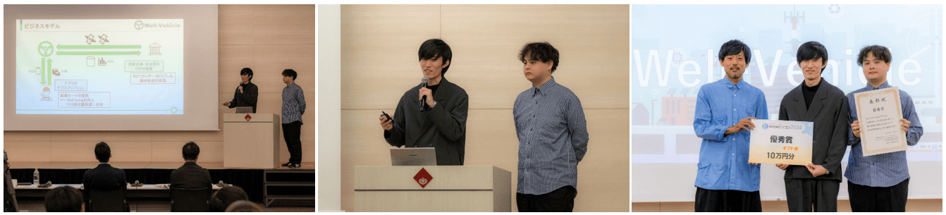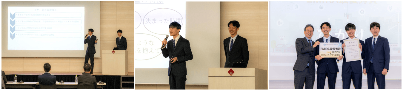 全142チームの中から、審査によって選ばれた4チームが本コンテストに出場しました。「モビリティ×エネルギー」をテーマとして、各チームがプレゼンテーションを展開しました。EMIRA最優秀賞は、トピタル(TaxiOfHospital)を提案した『ひかり』が受賞。最優秀賞の詳しい発表内容は「EMIRA」で掲載予定です。また、KADOKAWA賞は『のらりくらり』、TEPCO賞は『椙山女学園大学現代マネジメント学部』、優秀賞は『Well-Vehicle』が受賞しました。