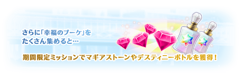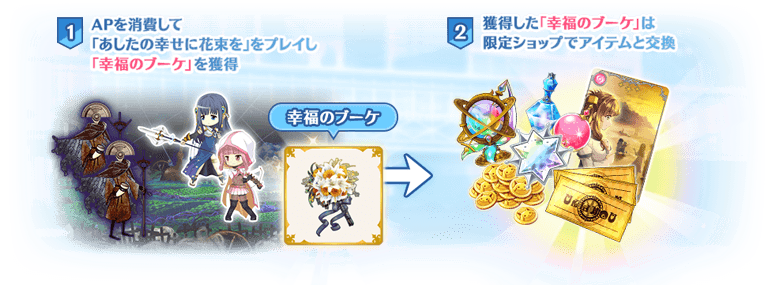 APを消費し、本イベントのクエストをプレイすることで、イベント限定ショップで、限定メモリアや限定ホーム背景、ガチャチケット等のアイテムと交換できる「幸福のブーケ」を獲得できます。