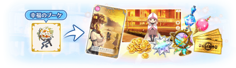 本イベントで獲得した「幸福のブーケ」は限定メモリア「幸せは黄昏に溶けて」や限定ホーム背景「あしたの幸せに花束を」そのほか貴重なアイテムとも交換できます。