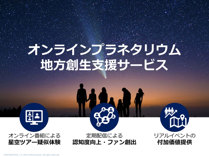 株式会社アストロコネクト(本社:神奈川県川崎市多摩区 代表取締役:荒井大作、以下、アストロコネクト)は、アフターコロナを見据えて地方創生におけるオンライン活用をご検討されている地方自治体様・観光企業様向けに、「オンラインプラネタリウム地方創生支援サービス」を提供いたします。星空・映像技術・オンライン配信の専門家が現地イベント企画からオンラインイベント提案、配信までをワンパッケージでサポートいたします。