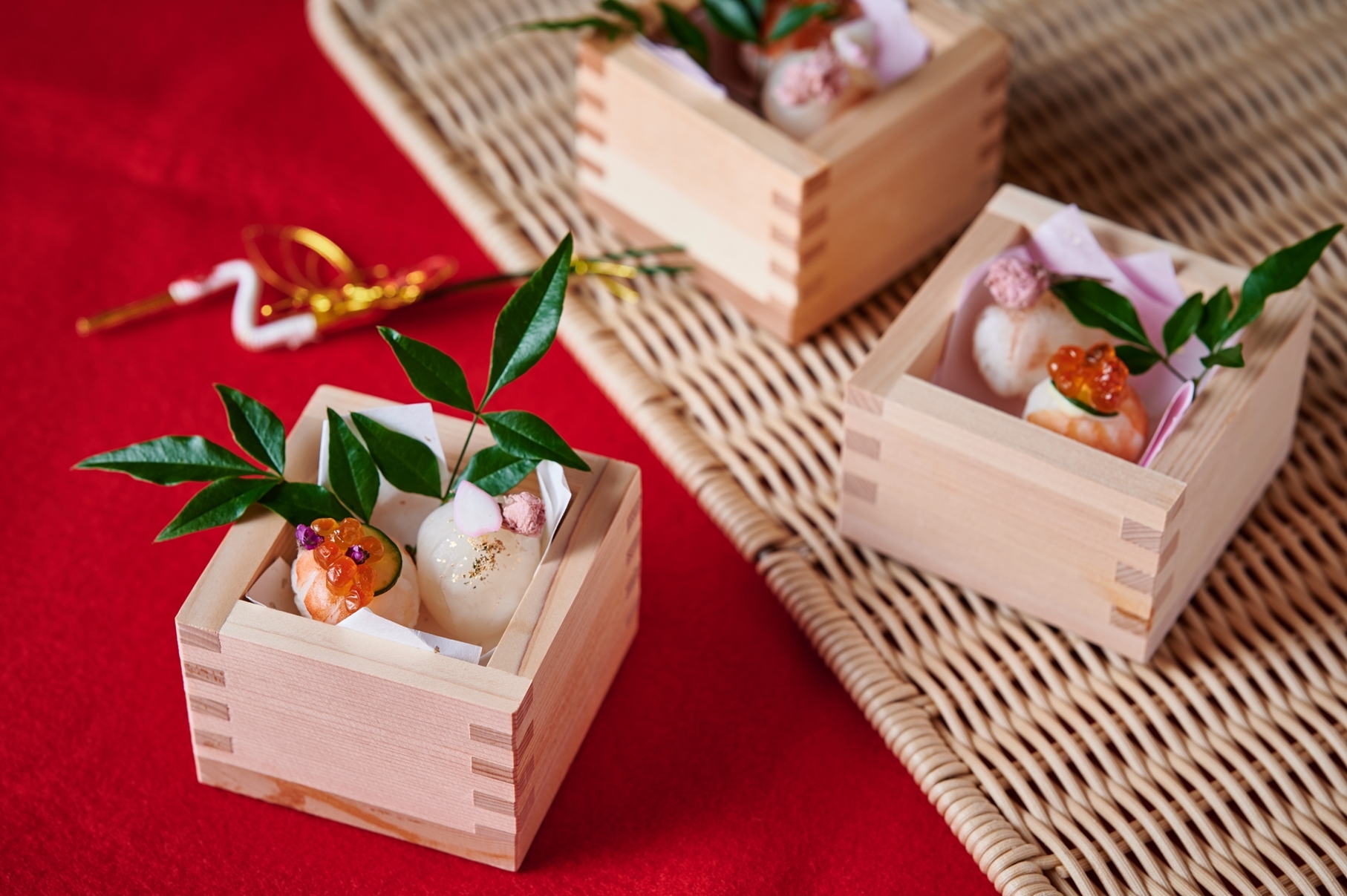 感謝の気持ちを届けるおもてなしの心をかたちに。縁起の良い桝に手毬寿司を入れて、おひとりおひとりにお配りします。桝に入ったいくらをふたりでかけて仕上げるオプションも。