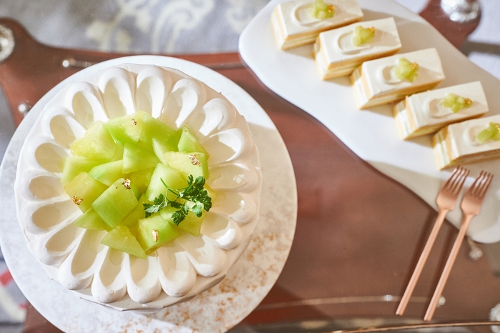 プレミアムフルーツの完熟された濃厚かつ芳醇な甘さと、まさに上質な卵だからこそできる濃密でしっとりとしたスポンジ、和三盆の上品な甘さがアクセントになったコクのある最高の生クリームといった贅を極めた素材を合わせ、ベストブライダルのトップパティシエチームが創り上げた至高の逸品。メインとなる厳選フルーツは、全国でも有数のメロン産地として知られる静岡県産の完熟マスクメロン「天音メロン」。季節により、厳選された高級ブランドフルーツ、シャインマスカットや、マンゴー、イチゴなども変更が可能です。「家族だけだから、ケーキ入刀は恥ずかしい。でも、美味しいケーキで幸せのお裾分けはしたい」。そんなご要望を受けて誕生した、徹底的に味にこだわったケーキです。