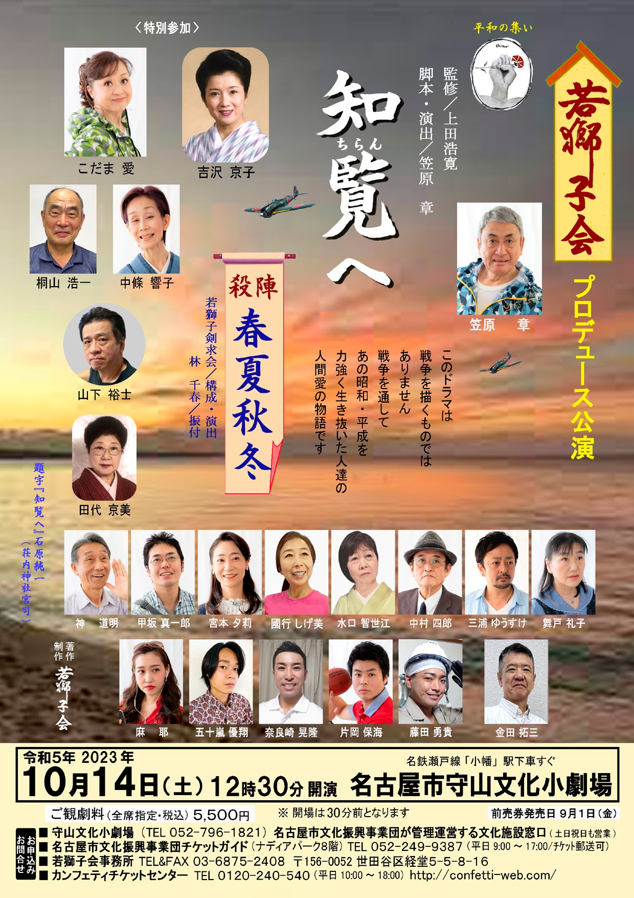 一般社団法人若獅子会(代表:笠原 章)主催、『知覧へ』『殺陣 春夏秋冬』が東京・名古屋にて上演されます。