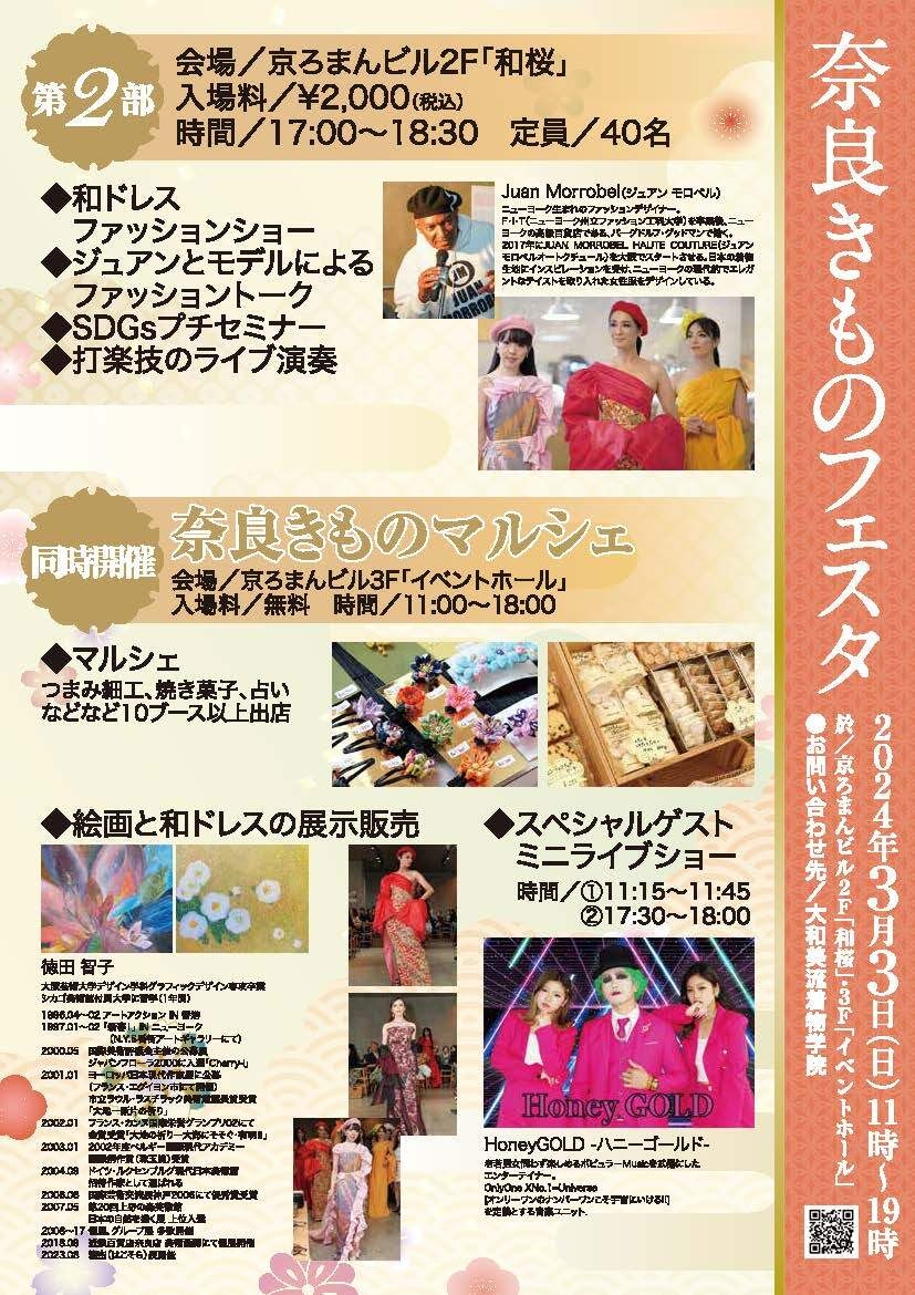 また同日企画として三条通りにある当社京ろまんビルにて「奈良きものフェスタ」を開催いたします。フェスタ1部は2F「和桜」でお抹茶とお雛様のおもてなし、東大寺大仏殿再建の講話や紙芝居、和太鼓や篠笛によるパフォーマンスを開催。フェスタ2部では和ドレスのファッションショーやデザイナートークショーを開催します。また3Fイベントホールでは、奈良きものマルシェとして、つまみ細工など10ブース以上の楽しいマルシェを出店し、さらには絵画と和ドレスの展示販売会やPOPS音楽ユニットのミニライブショーも開催し、和文化振興に取り組みます。