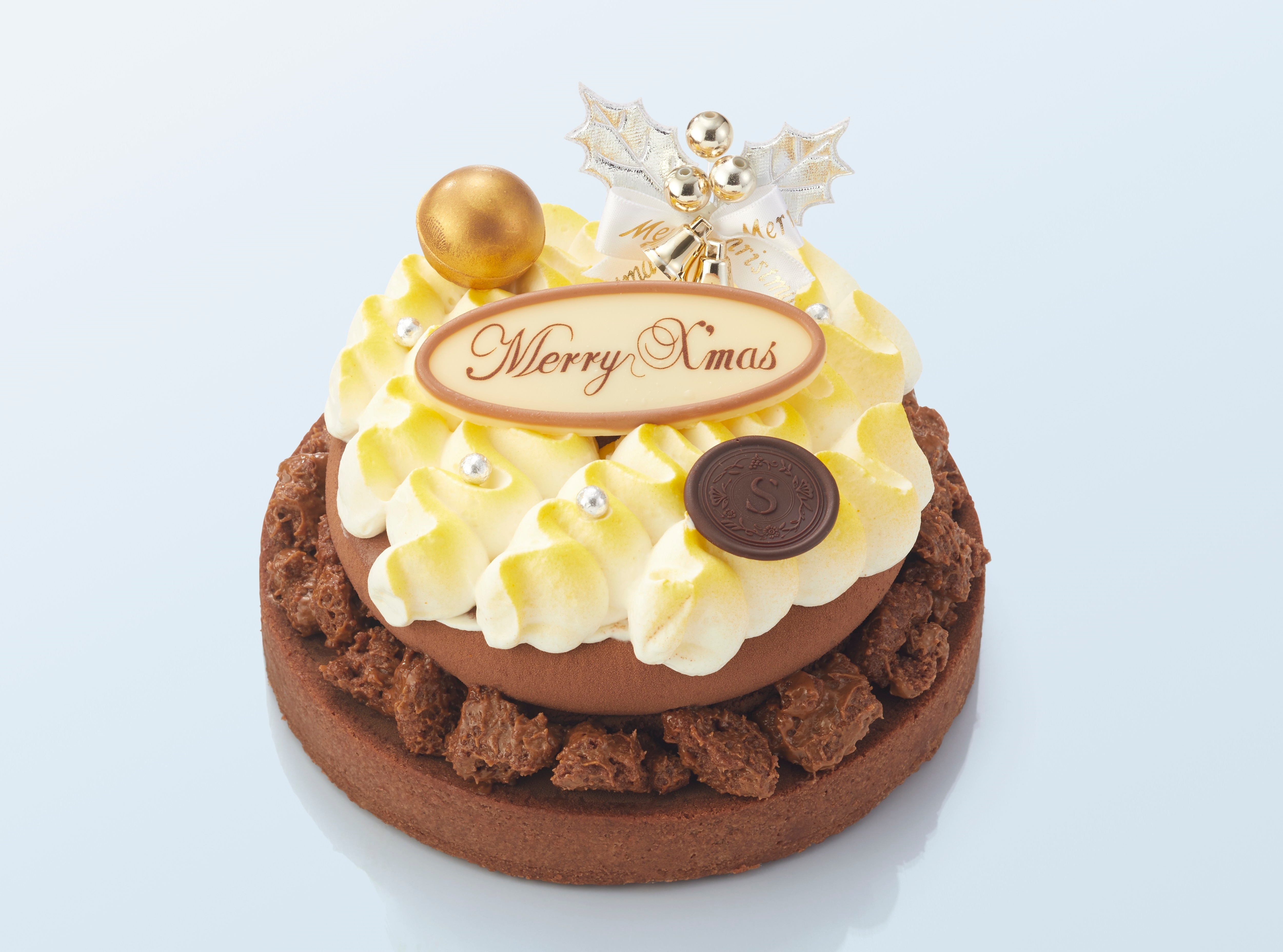 カカオの型の器をチョコレートでつくり、シェフが一つひとつ手作業でカカオの模様を描きました。中はチョコレートムース、オレンジジュレやバナナガナッシュなどを重ねて7層に。味の奥行と調和を楽しめるガトーは、聖夜にふさわしい美しいクリスマスケーキです。