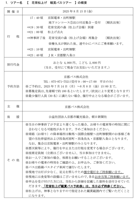 京都バス株式会社(本社:京都市右京区 代表取締役社長:吉本直樹)は、2025年8月15日(金)に左京区花脊八桝町にて催される「花背松上げ」、2025年8月24日(日)に左京区広河原下の町にて催される「広河原松上げ」行事に合わせ、「観賞バスツアー」をそれぞれ企画・販売します。例年、当ツアーは帰着地を京阪電車出町柳駅としていましたが、本年は四条河原町・四条烏丸・京都駅八条口まで範囲を広げ、京都市内中心部にご宿泊のお客様にもご利用いただきやすいツアーとしました。
