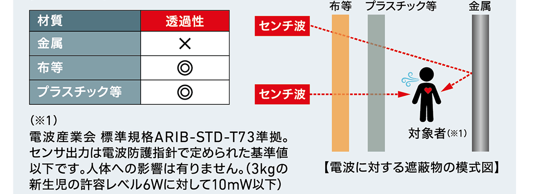 レーダーセンサーの電波(センチ波)は金属以外の様々な物質に対する透過性を持ち、障害物の影響を受けにくい特長があります。その機能により、間に遮るものがあっても、人を検知することが可能です。