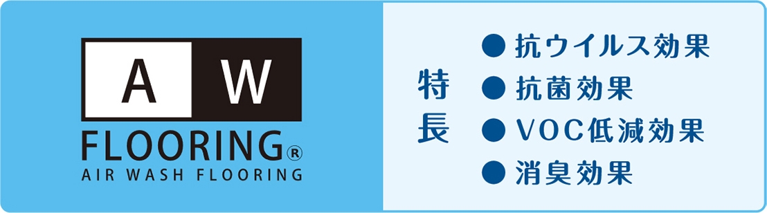 「エアー・ウォッシュ・フローリング」とは、「暗所対応型の最適化複合光触媒」の技術を用いて、床に落下するウイルスや細菌・VOC・臭いの原因物質等を除去する独自の複合フローリング材です。