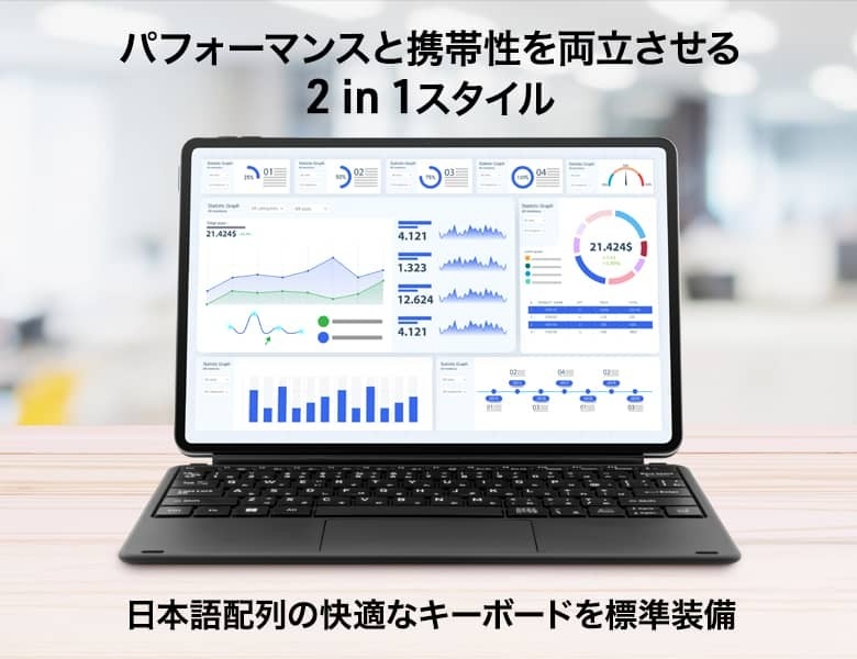 オフィスも外出先も自由自在で仕事のスタイルを進化させる2 in 1タブレット。日本語入力が快適なキーボードを標準装備、12.6インチの絶妙な画面サイズで持ち運びやすさと作業効率を両立します。無段階角度調整が可能なカバー兼スタンドで、社内のフリーアドレスや外出先でもこれ一台でスムーズに仕事をこなせます。