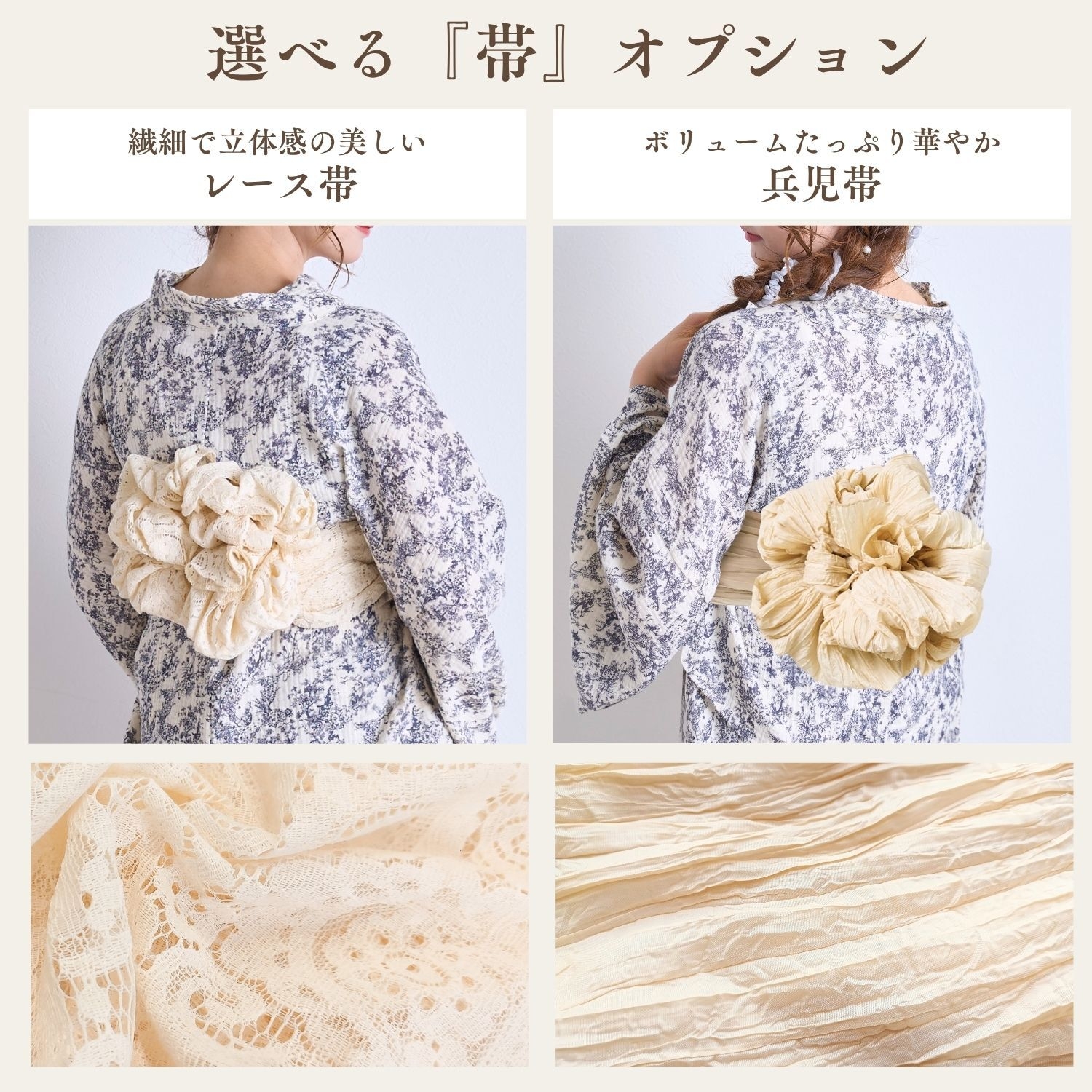 更に、選べるオプションとしてレース帯と兵児帯をご用意。どちらも扱いやすい素材なので、浴衣初心者でも誰でも簡単に“浴衣美人”になることができます。
