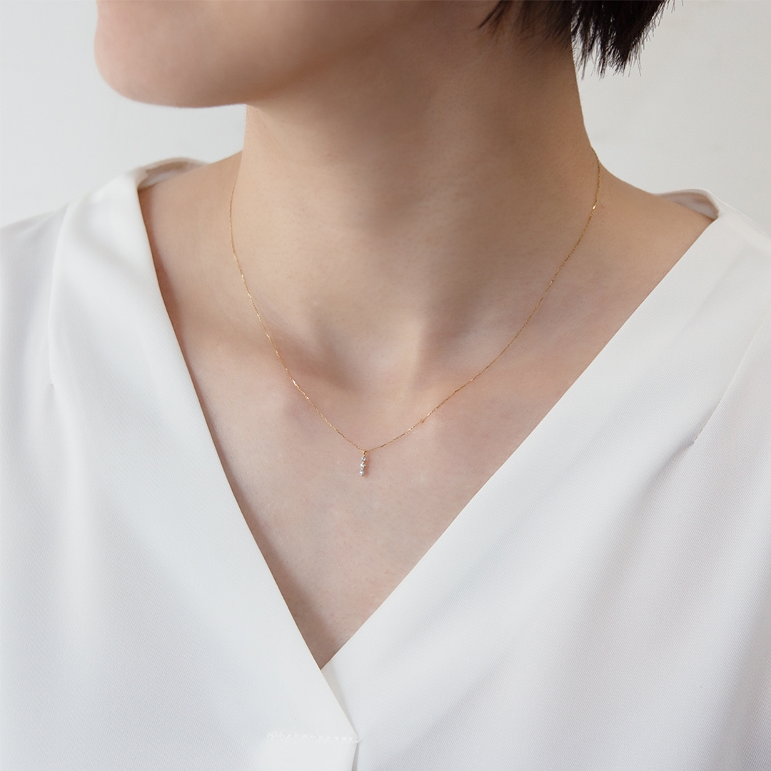 3つのメレダイヤモンドが、胸元でさりげなくきらめくネックレス。繊細なチェーンと小ぶりなペンダントトップの組み合わせは自然と肌に馴染むことから「スキンジュエリー」とも呼ばれ、まるで自分の一部かのようにデイリーに身に着けられます。