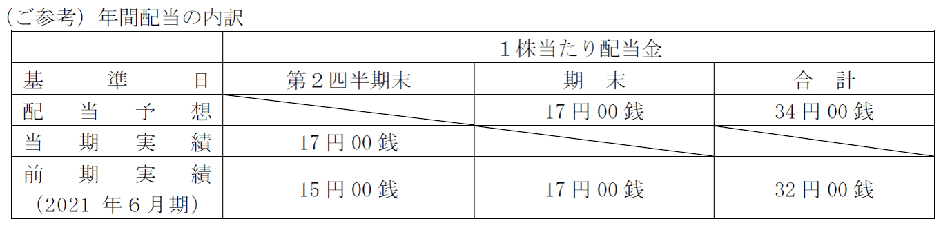 この方針に基づき、2022 年6月期の中間配当につきましては、直近の配当予想のとおり1株当たり17 円とさせていただきます。