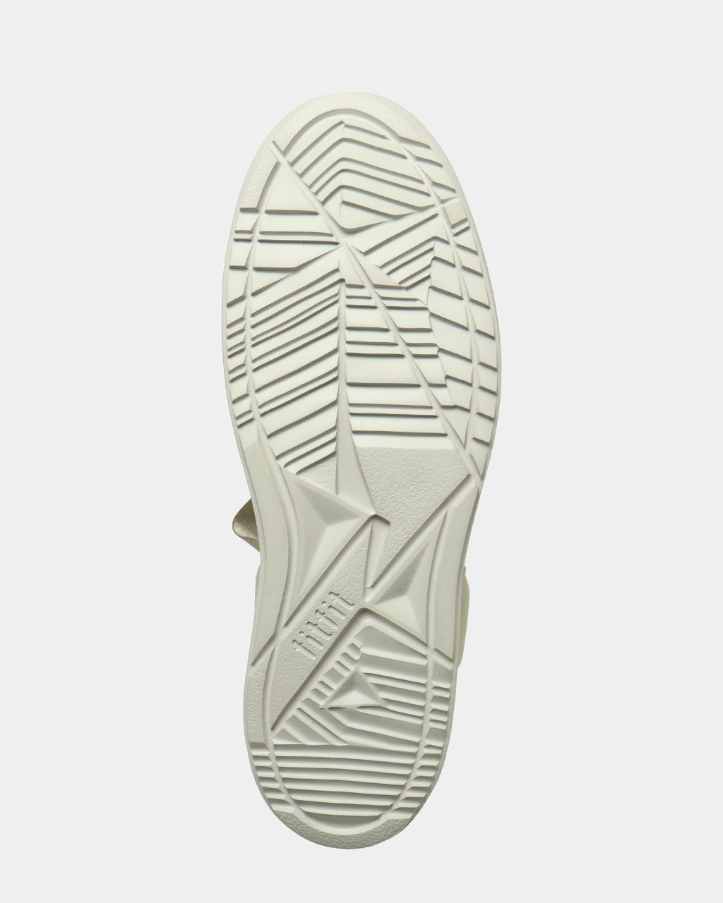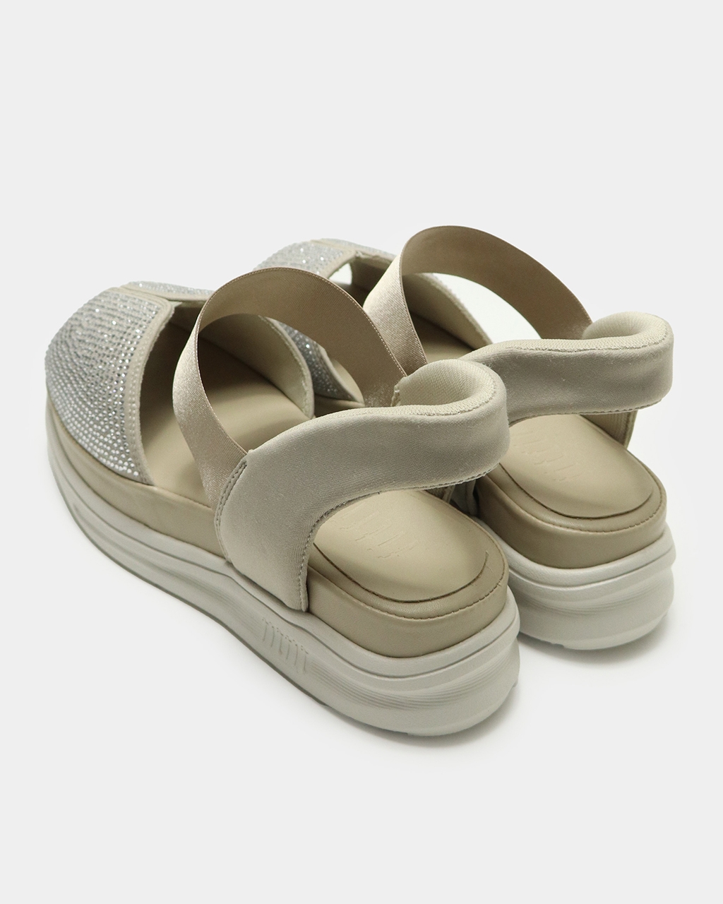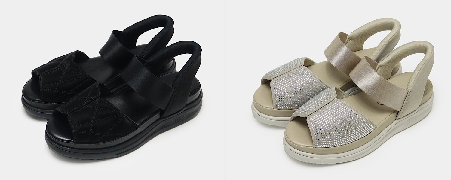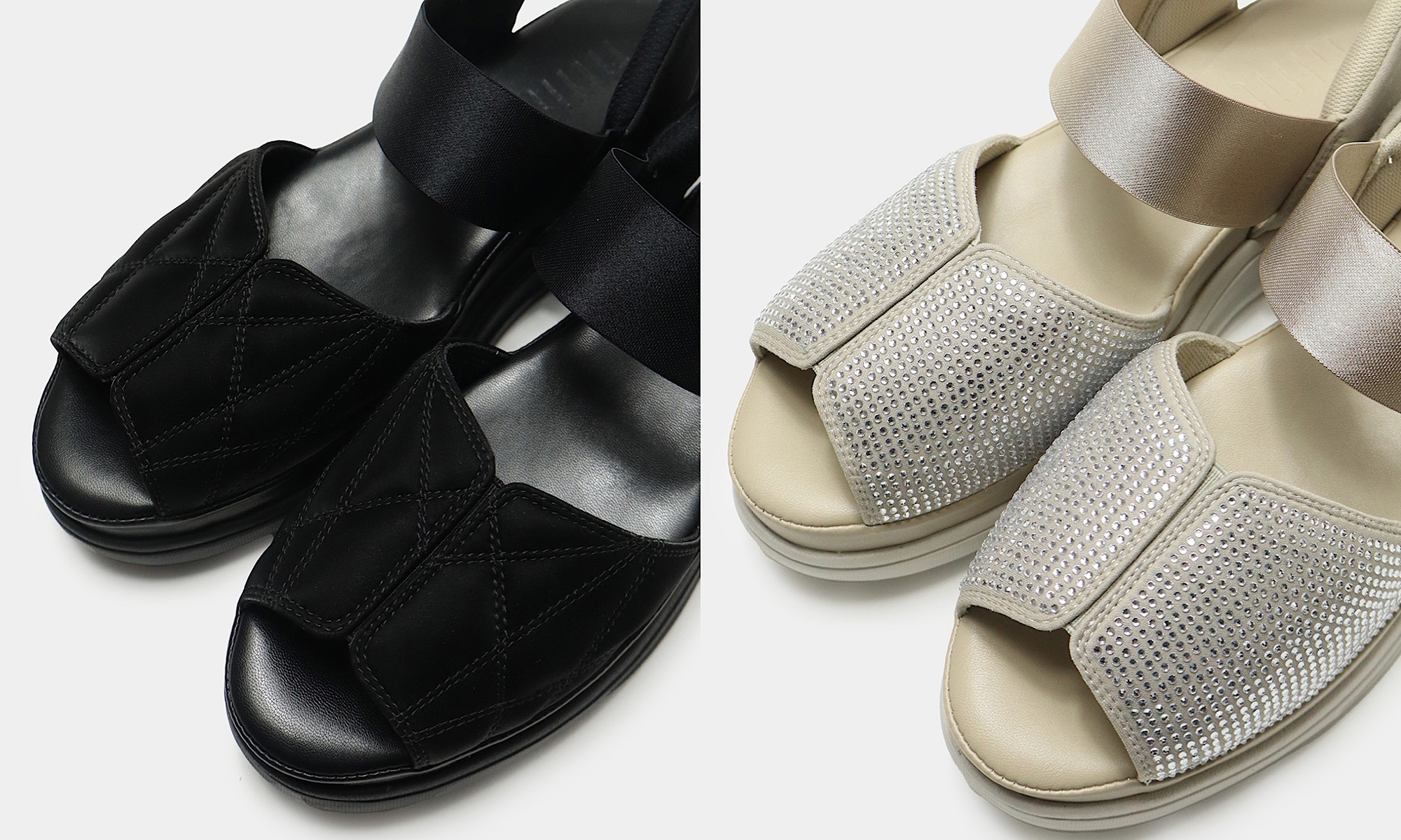 アッパーは足あたりのやさしいパデット仕様。前方中央には目立たないようにゴムを配し、足首ゴムベルトも艶素材を選ぶなど、快適なフィット感を確保しつつ、デザイン性も妥協なし。ブラックは直線的なジオメトリック柄のキルト素材、ラメベージュはラインストーンをあしらった華やかな仕様。デザイン性も履いた時の印象も、異なる魅力を持つ2色展開でお届けします。