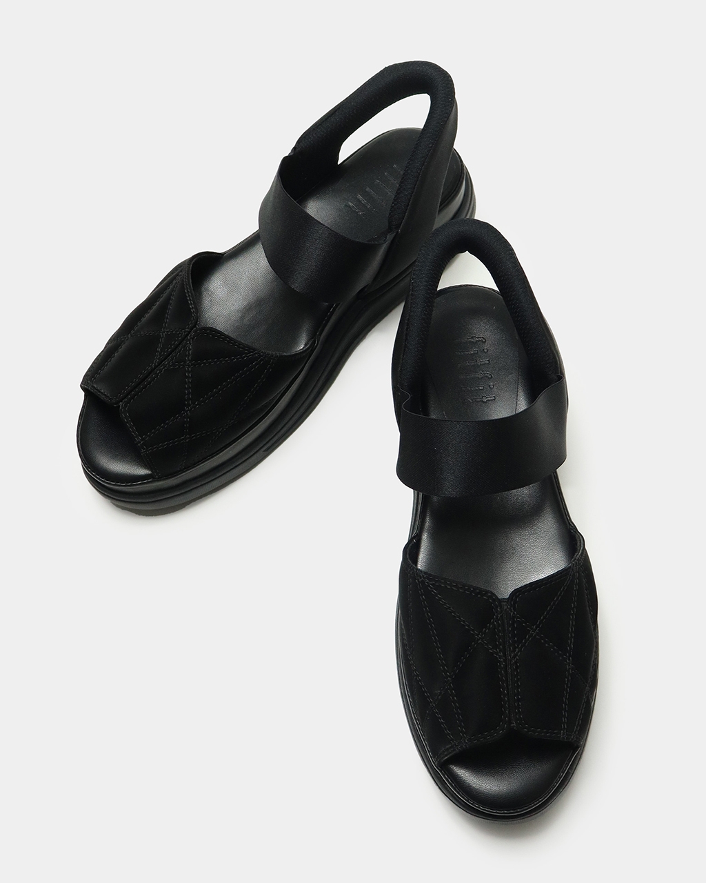 「ストッキングにベルクロが引っかかる」「S字フックが面倒」など、サンダル特有の脱ぎ履きのストレスを解消。かかと部分にオリジナルのハンズフリーパーツを採用し、手を使わずにスッと履ける設計に。しっかりホールドしながらも痛くなりにくい構造で、サッと履けてしっかり歩ける一足です。