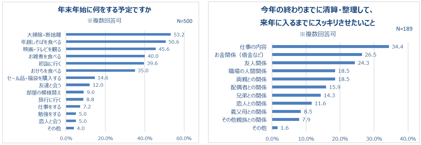 本調査では、年末年始の過ごし方として半数以上の人が回答した「大掃除・断捨離」について深掘りして調査。さらに、今年中に整理・清算してスッキリさせたいことや、来年頑張りたいことなどを探りました。