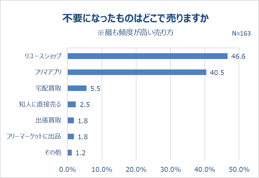 フリマアプリが普及し、売る方法も増えている昨今。「売る派」と答えた人にどこで売ることが多いか聞いたところ、「リユースショップ(46.6%)」、「フリマアプリ(40.5%)」に4割以上の票が集まりました。