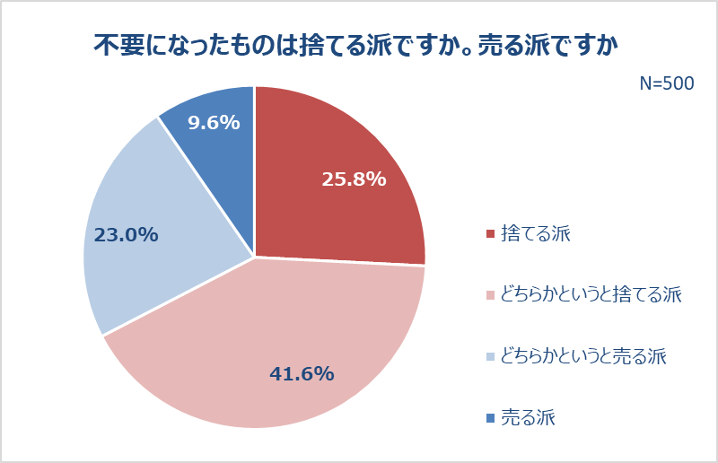 不要になったものは捨てるか売るか聞きました。結果、「捨てる派(25.8%)」「どちらかというと捨てる派(41.6%)」を合わせた、7割近くの人が捨てる派だと判明しました。