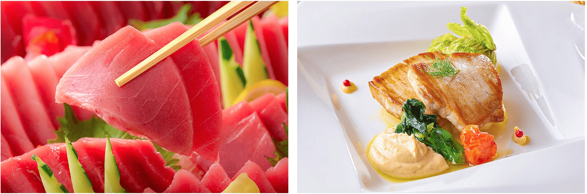 左:塩釜港水揚げの生まぐろは舟盛りでご提供します。一度も冷凍されない生のまぐろの美味しさはその身の弾力。もっちり、しっとりした身をご飯に乗せたり、宮城の地酒と合わせてお楽しみください。